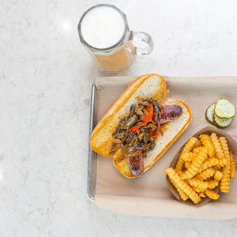 Sliced brisket, horseradish cream, Swiss cheese, and caramelized onions on a hoagie bun with a side of au jus.